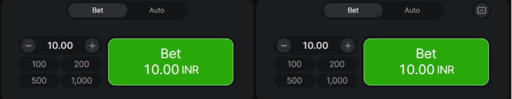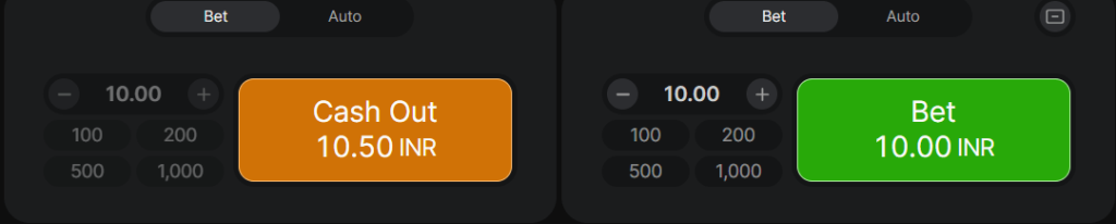 Aviator betting starts at ₹10. You can choose your bet amount by using the “-” or “+” buttons. You can also select one of the pre-chosen amounts.