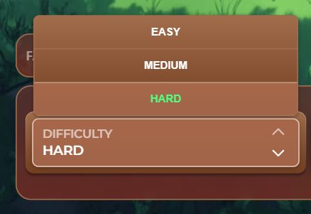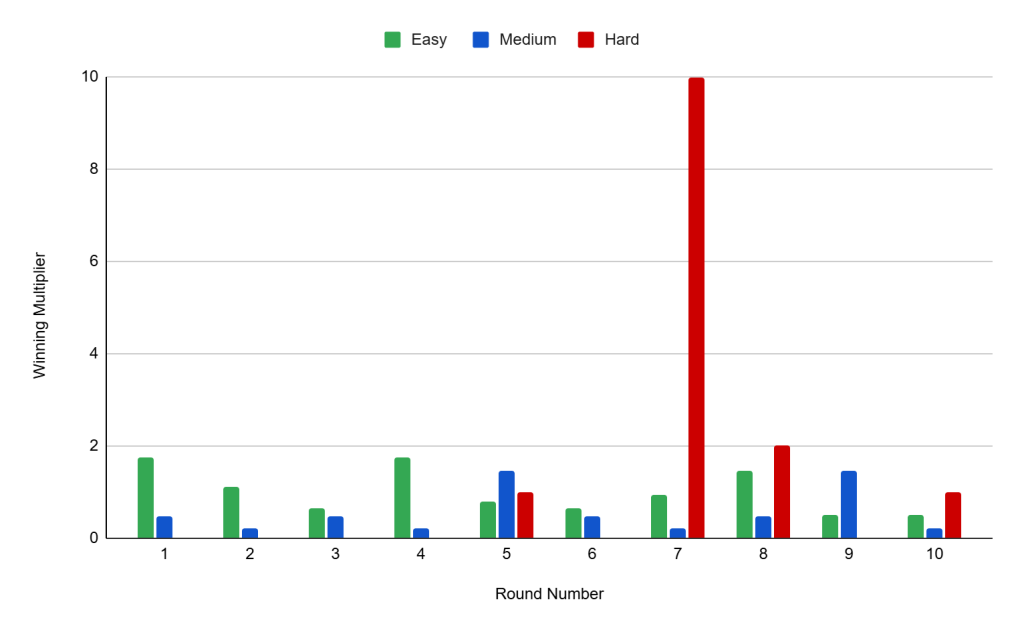 The game has three difficulty levels. Each level has its own set of multipliers. Easy has 0.2x – 10x, Medium has 0.2x – 50x, and Hard has 0x – 1000x.