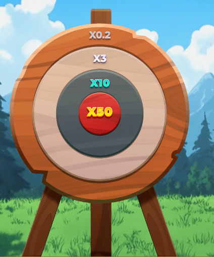 This game consists of an archery target with four rings. Each ring has a multiplier. Players then select a number of arrows to launch at the target. You earn a multiplier for every part of the target the arrow hits.