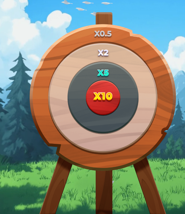 Forest Arrow is an instant game developed by InOut Games. Players shoot arrows at a target board with multipliers. Your multiplier (and winnings) depend on where the arrows land.