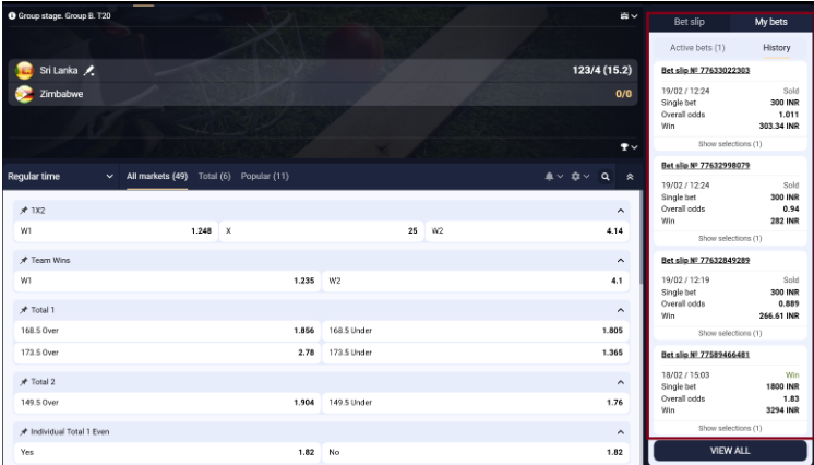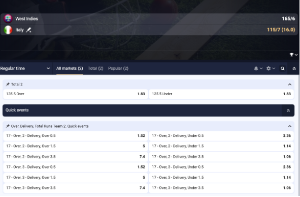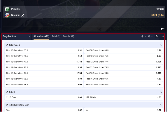 You can place bets over-by-over. Place bets on a specific score a team will reach within a particular over. For example – First 12 Overs Over 90.5 or First 12 Overs Under 90.5. This betting market is one of the most popular and rewarding, and odds are always competitive.