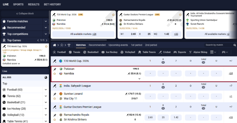 Markets like The Toss/The Match, Team 1, First Ball, and Accumulator Outcomes offer big returns on your stakes.